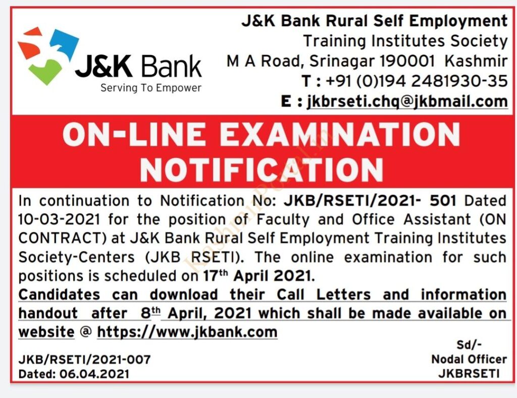 - Admit cards/Call letters for JKBANK RSETI will be made available from 8th April 2021